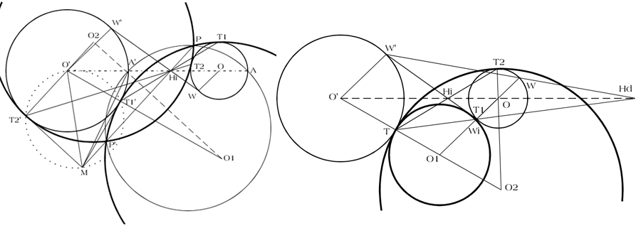 - Centro de homotecia inverso Hi, sumando a O”’ y restando a O” el radio R’. (R”’+R’ y R”-R’). Dos soluciones.