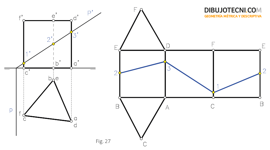 En el ejemplo, se traza la transformada de la sección (1, 2 y 3) producida por el plano proyectante P en el prisma.