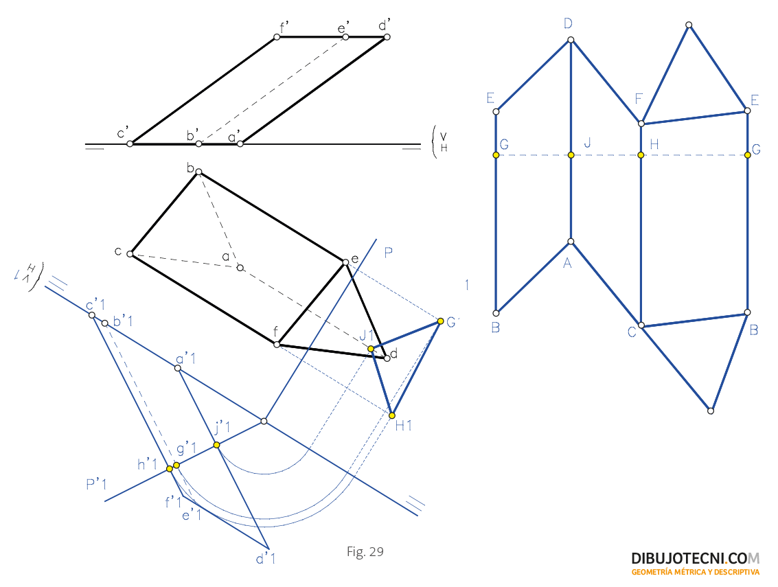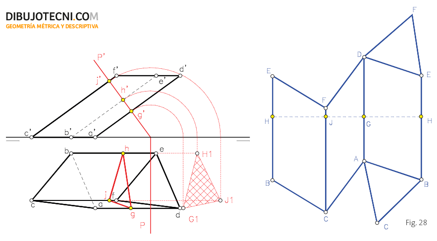 Calculamos la sección recta del prisma JHG auxiliándonos del plano secante P y dibujamos el segmento (HH) de longitud igual al perímetro del polígono de la sección que dividimos en partes iguales a los lados del mencionado polígono. Trazamos, por las divisiones del segmento H, J, G y H, rectas normales a este sobre las que llevamos las distancias en verdadera magnitud existentes entre los puntos de intersección del plano secante con cada una de las aristas del prisma y los extremos correspondientes de dichas aristas. Así por ejemplo llevamos sobre la perpendicular trazada al segmento HH por J las distancias hasta F y C por encima y por debajo respectivamente. F y C son vértices de las bases.