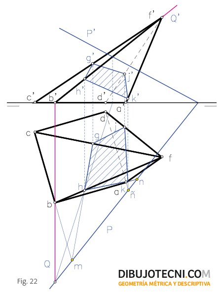 Calculamos un punto homólogo H de la base por alguno de los métodos habituales. Obtenido un punto H de la sección auxiliándonos de un plano proyectante vertical en el ejemplo de la figura 22, resolvemos el resto de la proyección horizontal de la sección por homología. Finalmente calculamos las proyecciones verticales de los vértices así obtenidos y unimos ordenadamente en ambas vistas. Los puntos n, m, y ñ son puntos dobles de la homología.