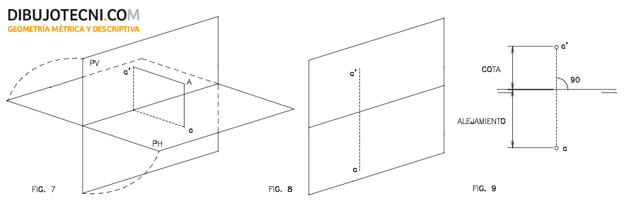 Un punto “A” se representa en este sistema mediante sus proyecciones ortogonales sobre el plano vertical y el horizontal. Estas proyecciones se denominan vertical y horizontal y se designan, con minúscula prima o mayúscula y subíndice 2 (a’ · A2) y minúscula o mayúscula y subíndice 1 (a · A1) respectivamente. Fig.7