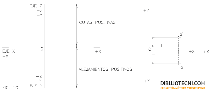 El punto queda así representado por sus proyecciones horizontal y vertical entorno a la Línea de Tierra, sobre una perpendicular a esta trazada (en línea de puntos) y a unas distancias determinadas: la distancia de la proyección vertical a LT denominada COTA y la distancia de la proyección horizontal a LT denominada ALEJAMIENTO. Fig.9