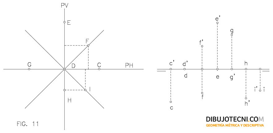- Contenido en los Planos de Proyección, en cuyo caso tendrá nula la cota si está en el PH o el alejamiento si está en PV.